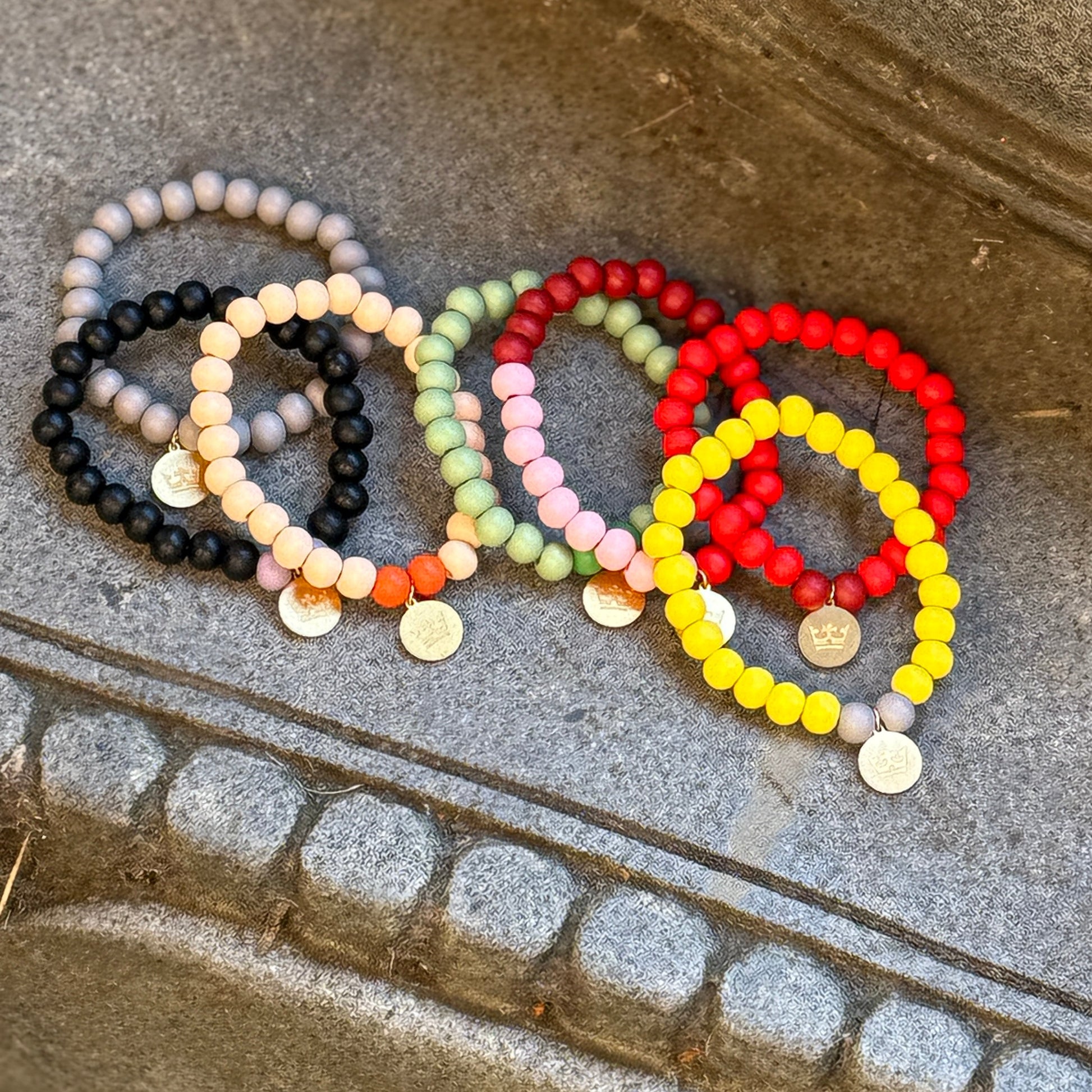 A clear, intense red – the epitome of modern elegance. This bracelet makes a powerful splash of color without ever being loud. The warm wooden beads harmonize effortlessly with the gold logo charm, creating a look that commands attention even in minimalism.