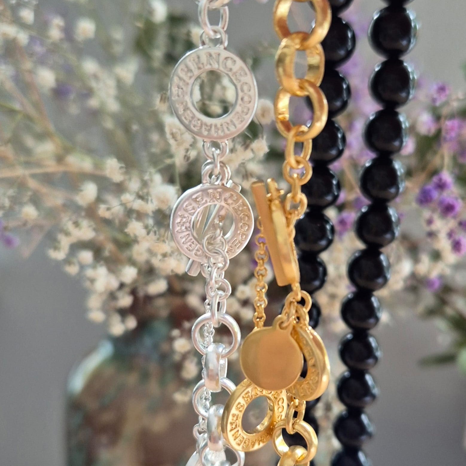 Diese wunderschöne Berry Halskette besticht durch ihre klaren Formen, Tiefschwarze Achatperlen, ergänzt von symmethrisch passenden Erbsgliedern. Der ikonische Logo-Ringverschluss von SENCE Copenhagen setzt einen dezenten Akzent und ermöglicht es, die Länge individuell zu variieren. Ein Schmuckstück, das zeitlose Eleganz mit vielseitiger Tragbarkeit verbindet.