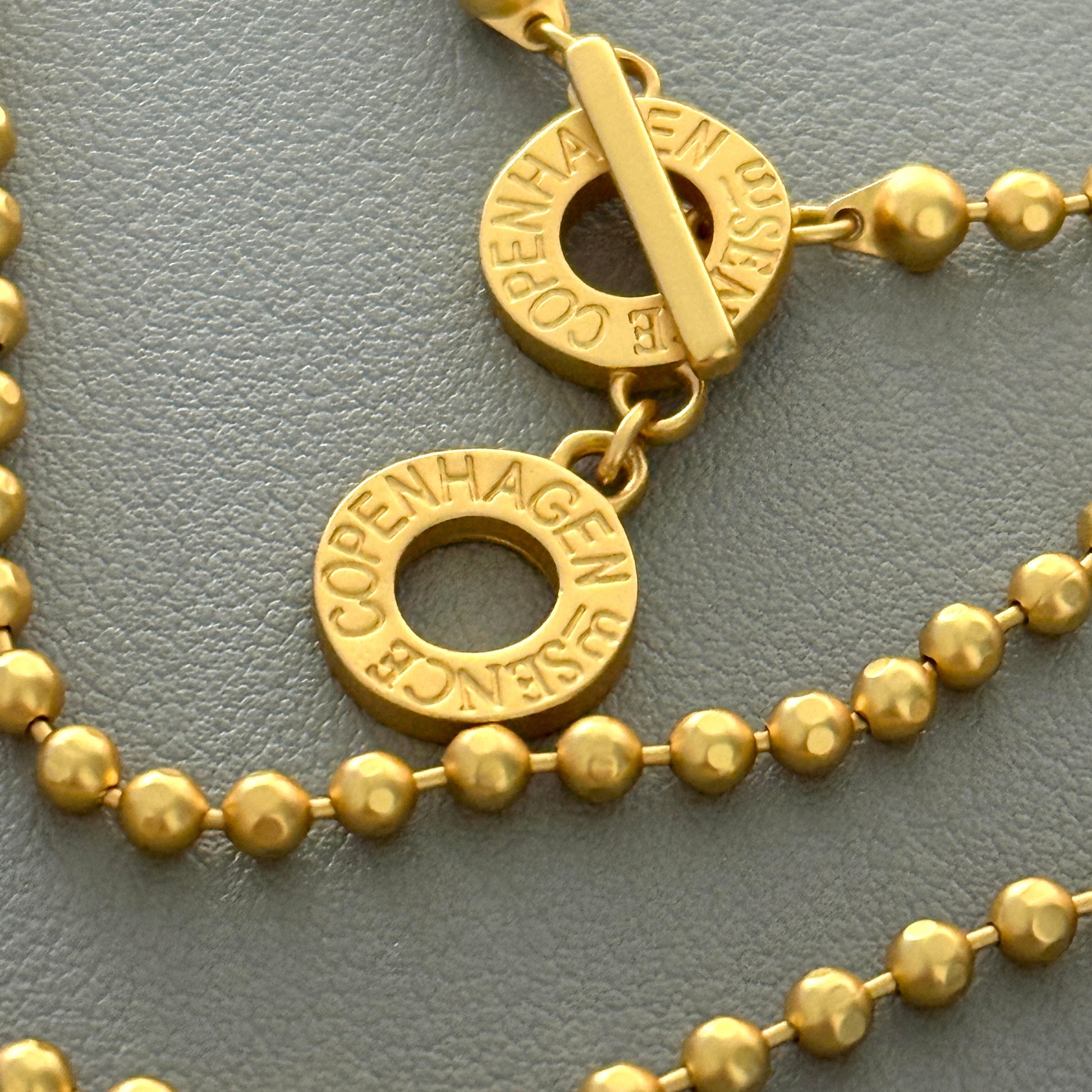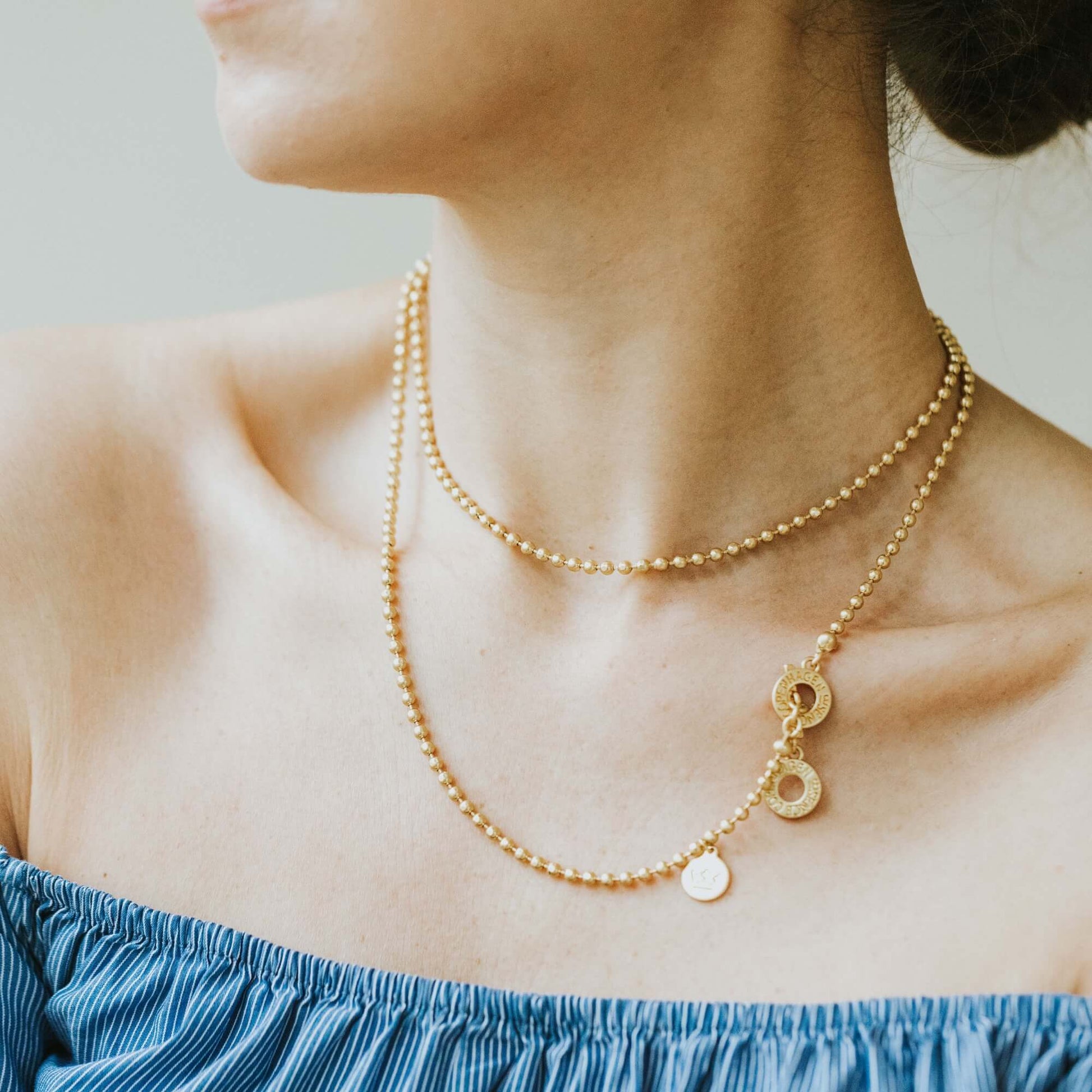 Eine Kette, die Vielseitigkeit und Raffinesse vereint: Fein gearbeitete Kugeln reihen sich auf einem filigranen Band aneinander und entfalten ihre klare, moderne Eleganz. Der ikonische SENCE Copenhagen Verschluss – zwei ineinandergreifende Ringe mit flexiblem T-Stück – ist nicht nur funktional, sondern auch ein stilvolles Detail, das den Charakter dieser Kette prägt.